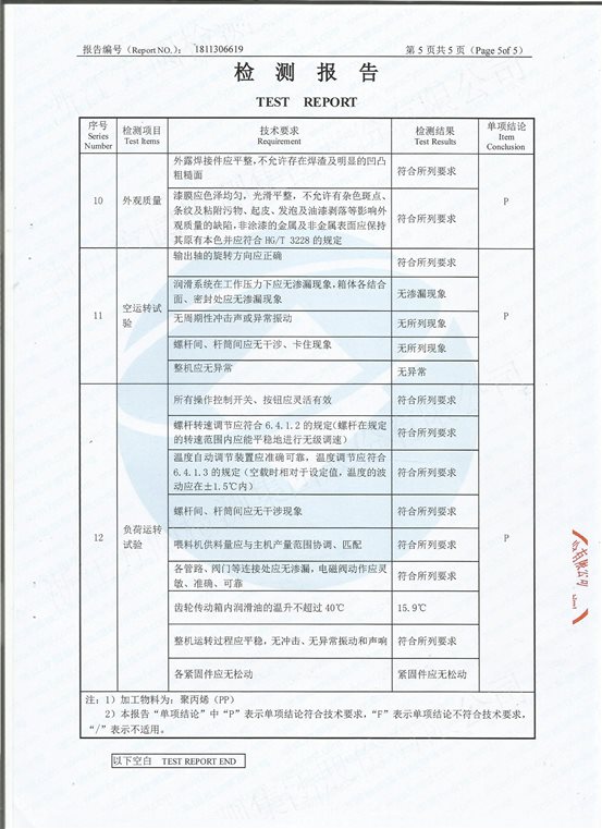 近期,我公司自主研制的SJSZ115型锥形同向双螺杆挤出机试机成功,样机通过浙江方圆检测集团权威检测,经检测,每小时产量可达2469公斤,实际比功率0.098!具体检测报告如下: